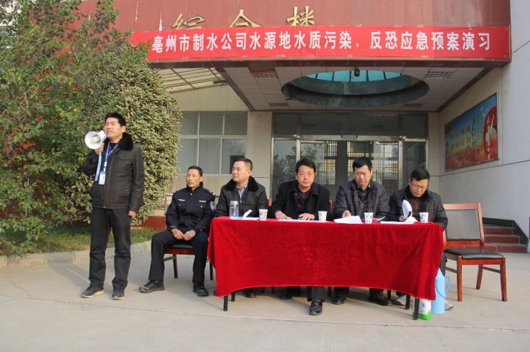 12月2日9時(shí),伴隨著劉海軍經(jīng)理的演習(xí)開始一聲令下,亳州市制水公司水源地水質(zhì)污染、反恐應(yīng)急預(yù)案演習(xí)正式拉開帷幕。參加本次演練的有市應(yīng)急辦李剛主任,公用事業(yè)處處長郁文處長、閆龍超副處長、環(huán)保局劉峰支隊(duì)長和經(jīng)開區(qū)公安分局陳冰隊(duì)長,制水公司劉海軍經(jīng)理擔(dān)任現(xiàn)場總指揮。