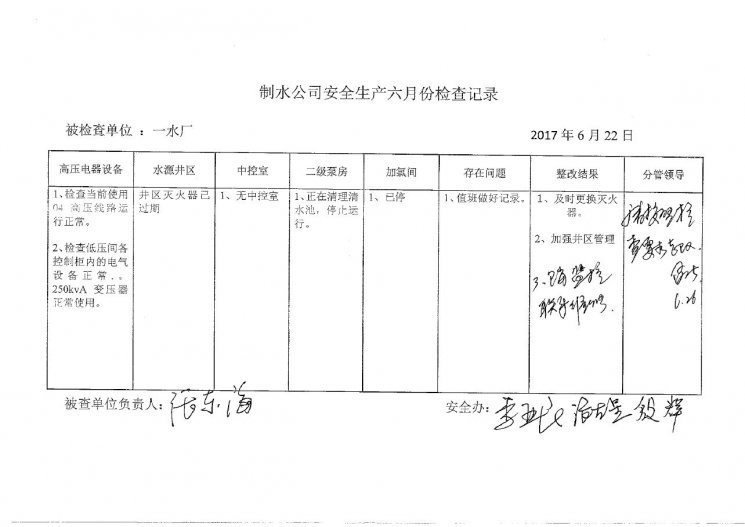 一水廠2017年6月安全生產(chǎn)檢查記錄