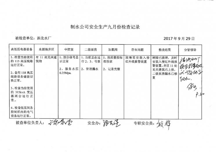 渦北水廠2017年9月安全生產(chǎn)檢查記錄