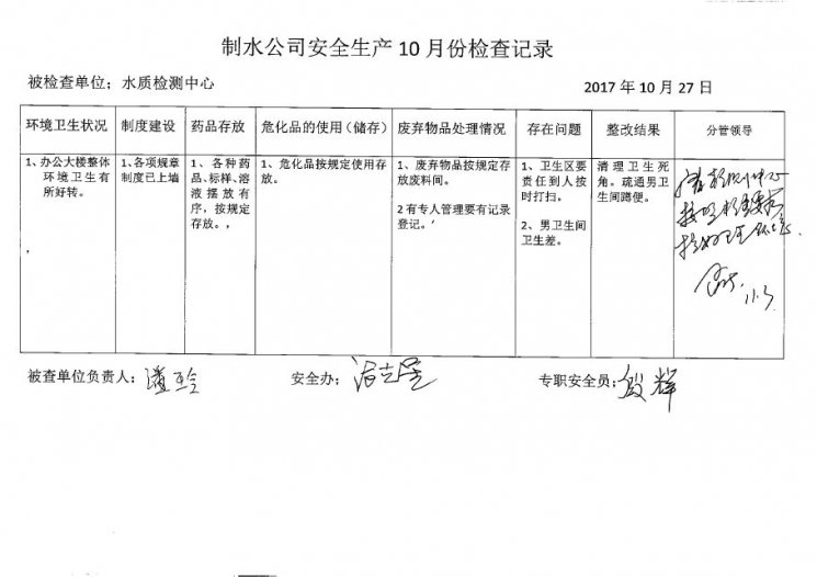 水質(zhì)檢測(cè)中心2017年10月安全生產(chǎn)檢查記錄