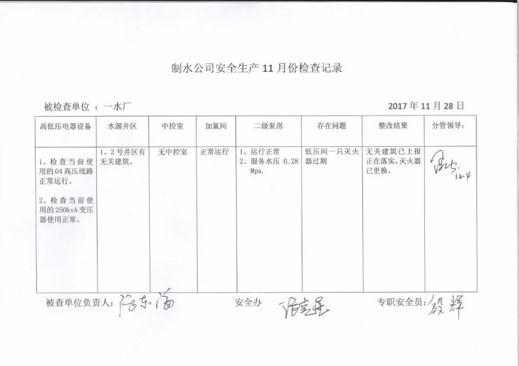 一水廠2017年11月安全生產(chǎn)檢查記錄