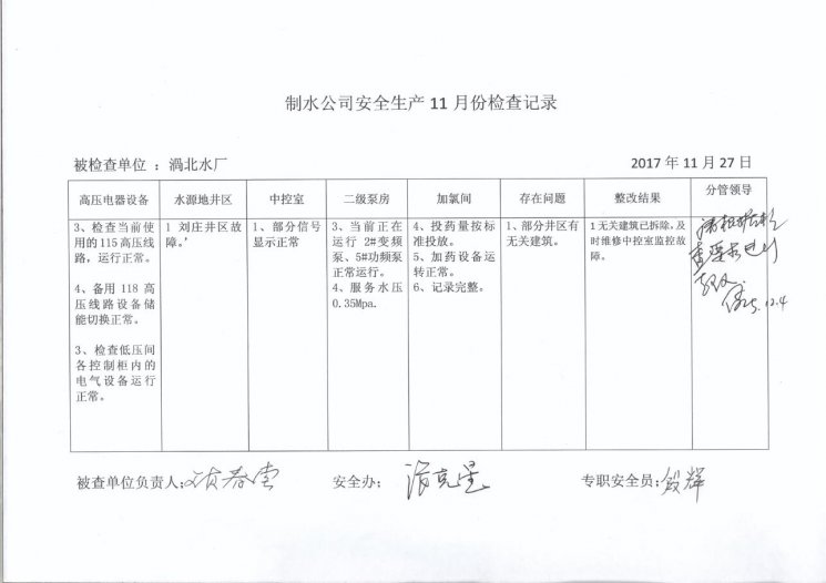 渦北水廠2017年11月安全生產(chǎn)檢查記錄