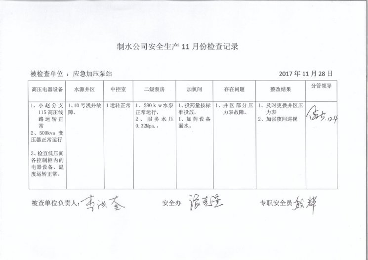 應(yīng)急加壓泵站2017年11月安全生產(chǎn)檢查記錄