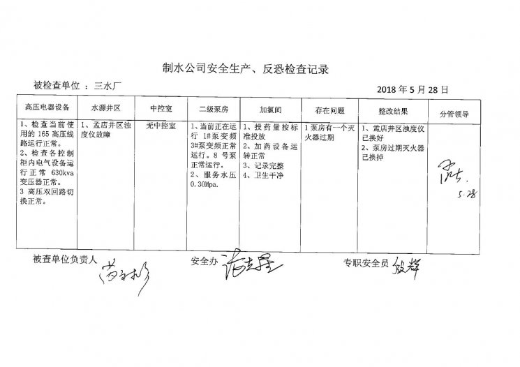 三水廠2018年5月安全生產(chǎn)檢查記錄