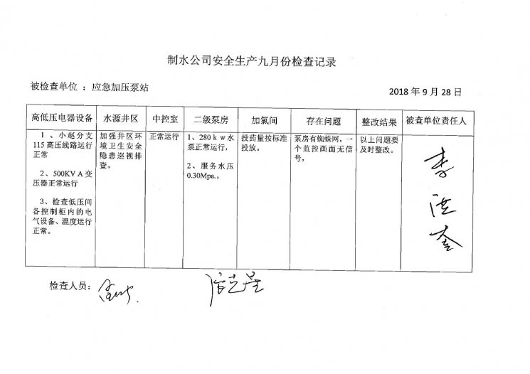 加壓泵站2018年9月安全生產(chǎn)檢查記錄