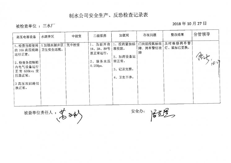 三水廠2018年10月安全生產(chǎn)檢查記錄