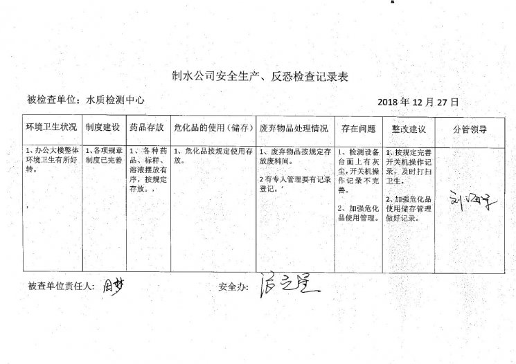 水質(zhì)檢測(cè)中心2018年12月安全生產(chǎn)檢查記錄