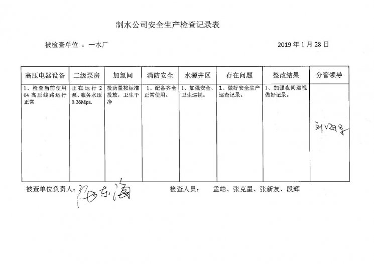 一水廠2019年1月安全生產(chǎn)檢查記錄