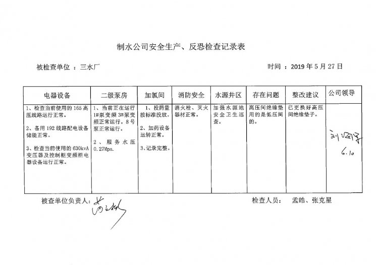 三水廠2019年5月安全生產(chǎn)檢查記錄