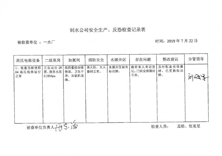 一水廠2019年7月安全生產(chǎn)檢查記錄