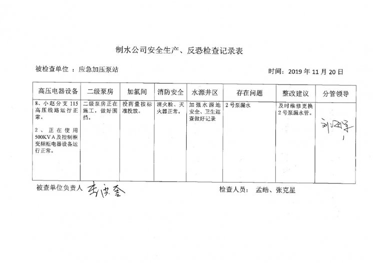 應(yīng)急加壓泵站2019年11月安全生產(chǎn)檢查記錄