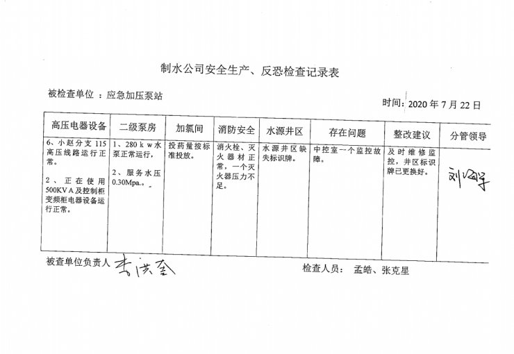 應(yīng)急加壓泵站2020年7月安全生產(chǎn)檢查記錄