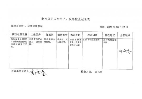 加壓泵站2020年10月安全生產(chǎn)檢查記錄