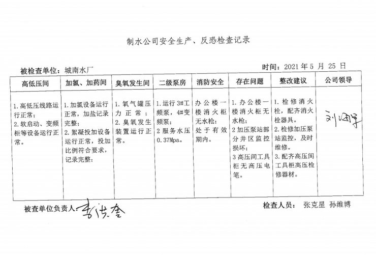 城南地表水廠2021年5月安全生產(chǎn)檢查記錄