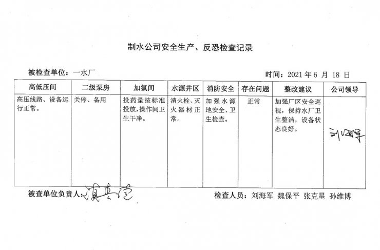 一水廠2021年6月安全生產(chǎn)檢查記錄