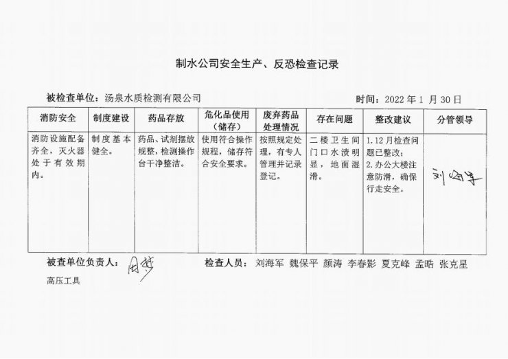 水質(zhì)檢測中心2022年1月安全生產(chǎn)檢查記錄