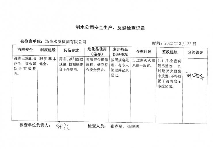 水質(zhì)檢測(cè)中心2022年2月安全生產(chǎn)檢查記錄