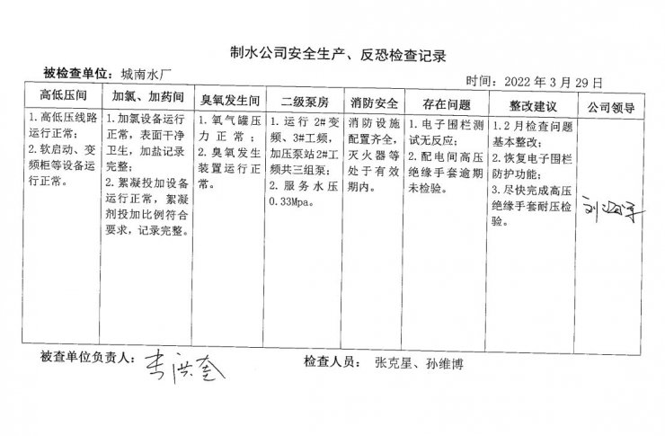 城南水廠2022年3月安全生產(chǎn)檢查記錄