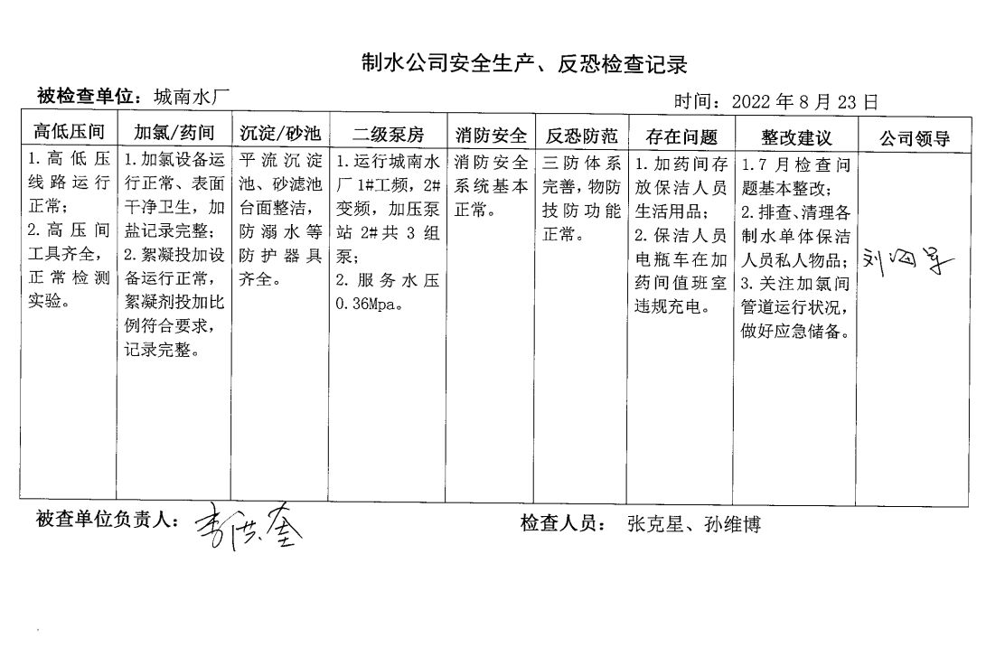 城南水廠2022年8月安全生產(chǎn)檢查記錄