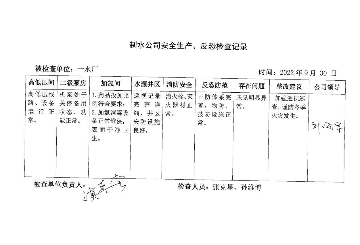 一水廠2022年9月安全生產(chǎn)檢查記錄