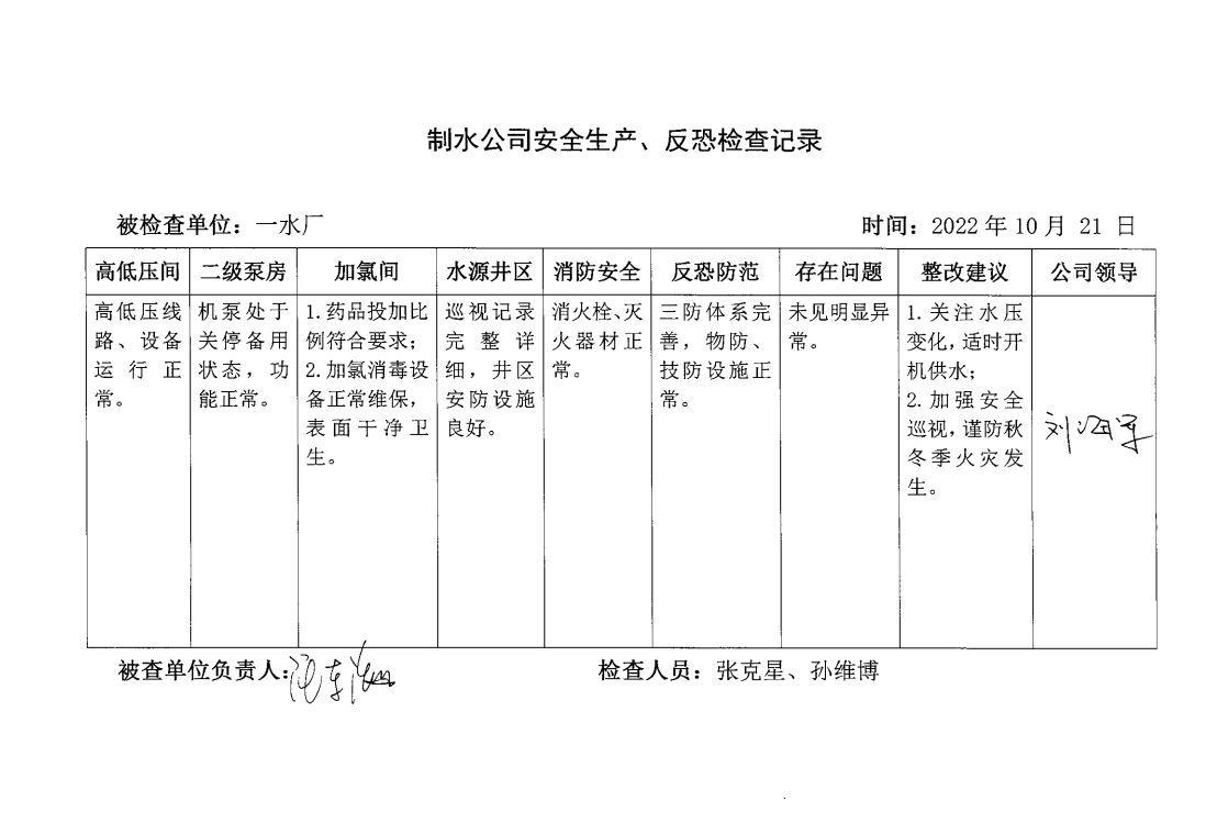 一水廠2022年10月安全生產(chǎn)檢查記錄