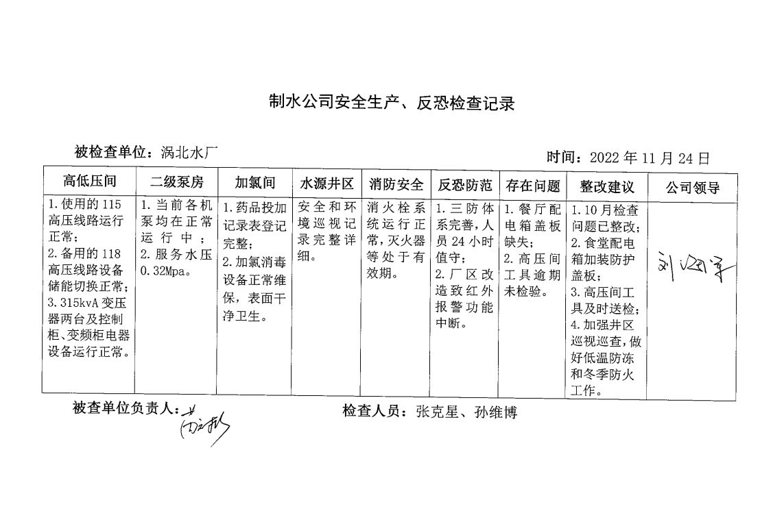 渦北水廠2022年11月安全生產(chǎn)檢查記錄