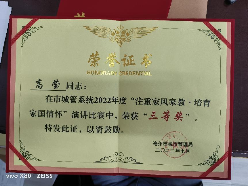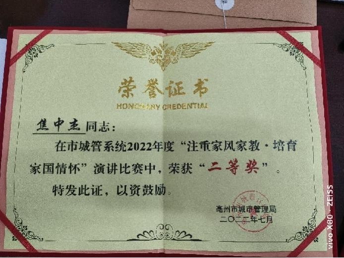為深入貫徹落實習近平總書記關于“注重家庭、注重家教、注重家風”重要指示精神,大力弘揚中華民族家庭美德,切實以家風促作風,由亳州市城市管理局舉辦的“注重家風教育?培育家國情懷”演講比賽已經(jīng)順利結束。賽中市制水公司焦中杰、高瑩兩位同志緊扣“注重家風家教?培育家國情懷”的主題,立足崗位,結合實際,經(jīng)過激烈的角逐最終分別獲得了二等獎、三等獎的優(yōu)異成績。