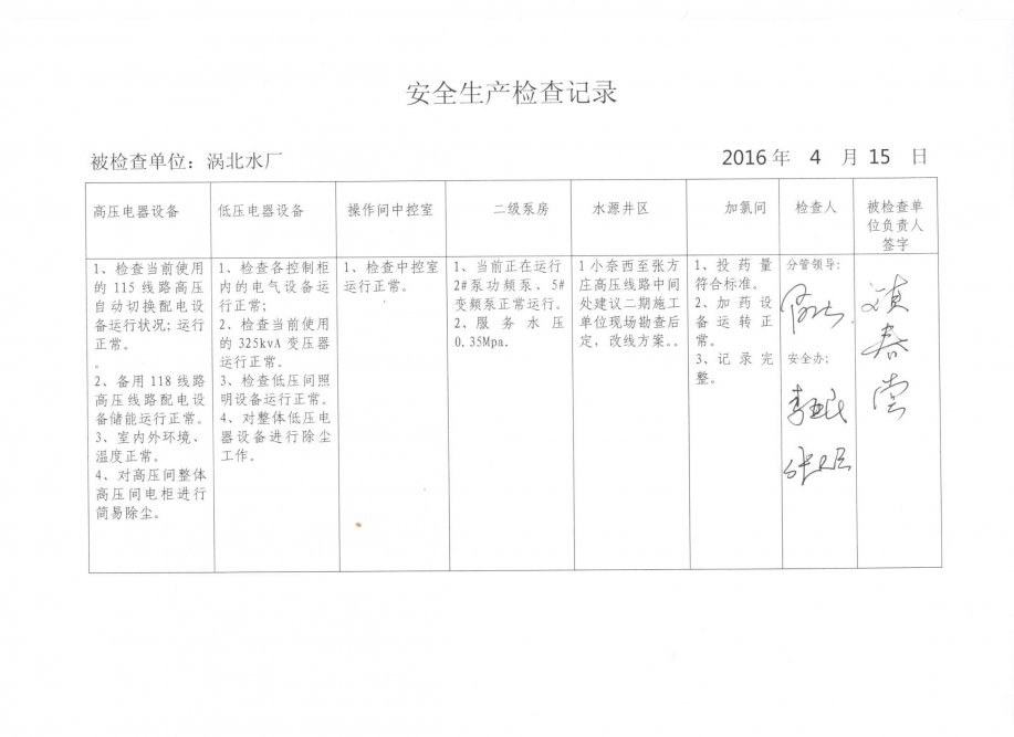 渦北水廠2016年4月安全生產(chǎn)檢查記錄