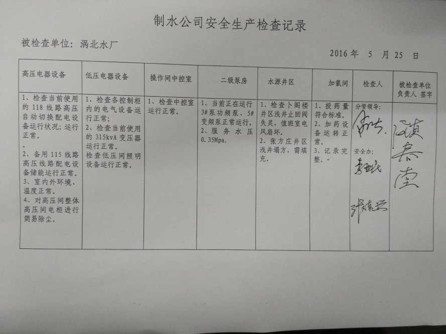 渦北水廠2016年5月安全生產(chǎn)檢查記錄