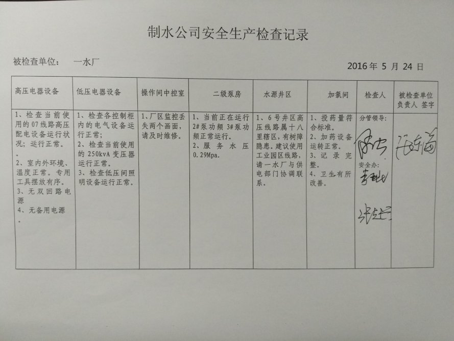一水廠2016年5月安全生產(chǎn)檢查記錄