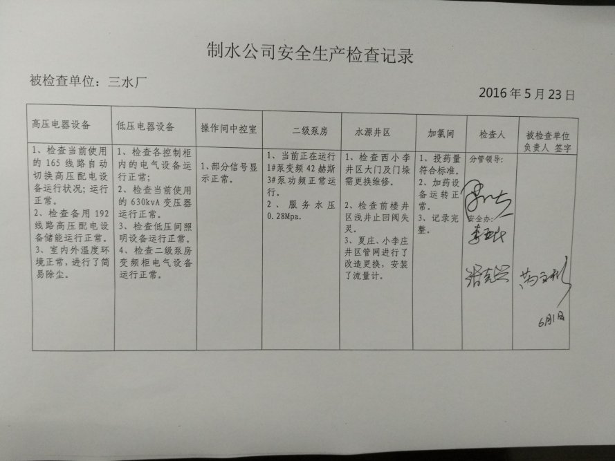 三水廠2016年5月安全生產(chǎn)檢查記錄