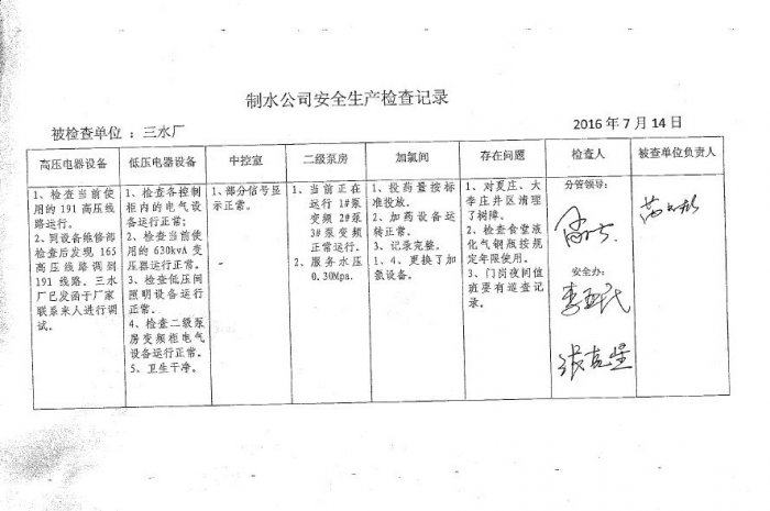 三水廠2016年7月安全生產(chǎn)檢查記錄