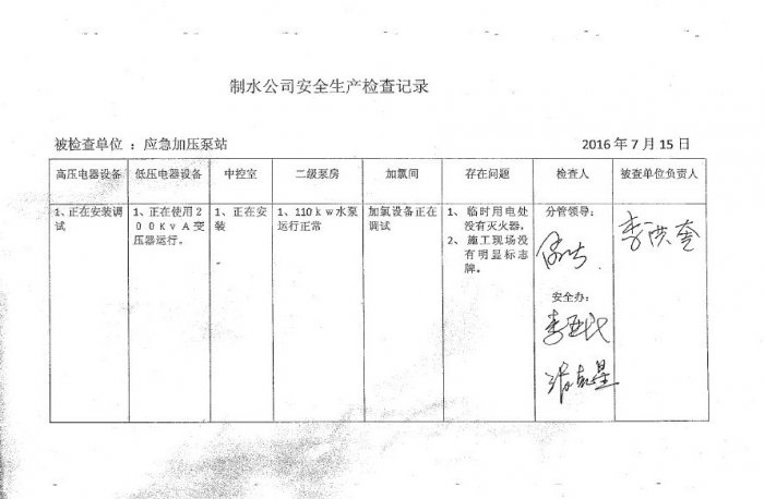 應(yīng)急加壓泵站2016年7月安全生產(chǎn)檢查記錄
