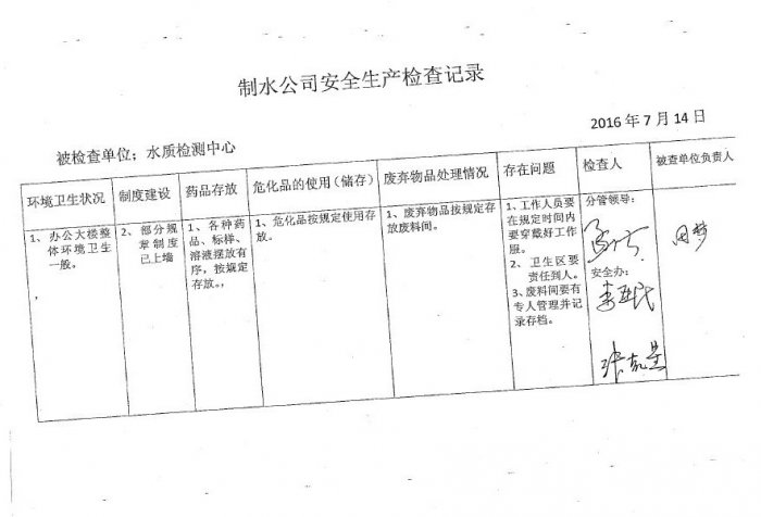 水質(zhì)檢測(cè)中心2016年7月安全生產(chǎn)檢查記錄