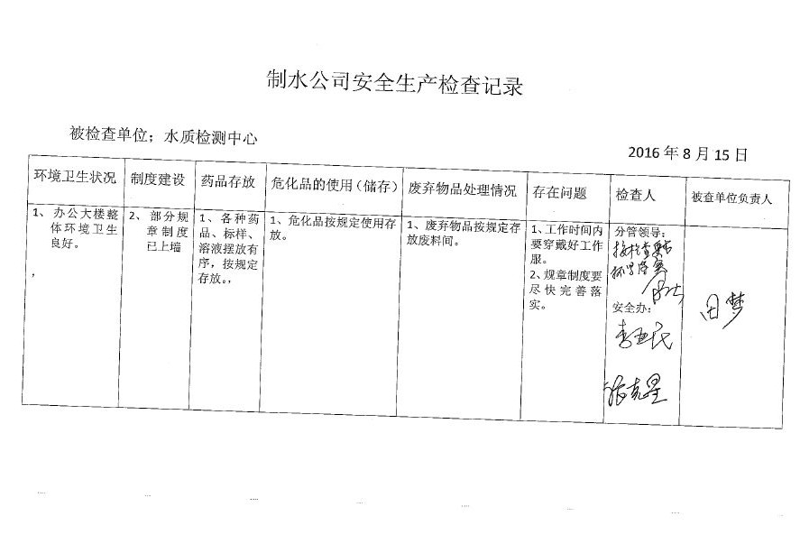 水質(zhì)檢測中心2016年8月安全生產(chǎn)檢查記錄