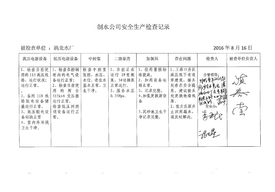 渦北水廠2016年8月安全生產(chǎn)檢查記錄