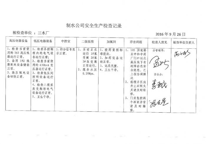 三水廠2016年9月安全生產(chǎn)檢查記錄