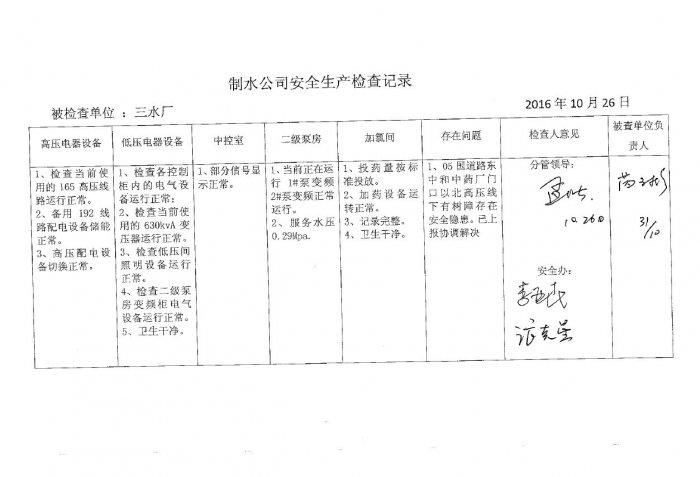 三水廠2016年10月安全生產(chǎn)檢查記錄