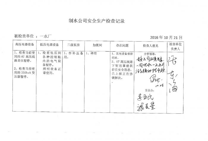 一水廠2016年10月安全生產(chǎn)檢查記錄