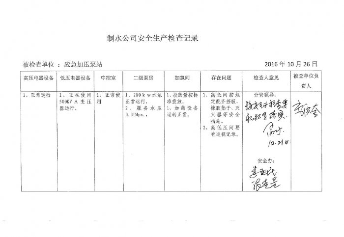 應(yīng)急加壓泵站2016年10月安全生產(chǎn)檢查記錄