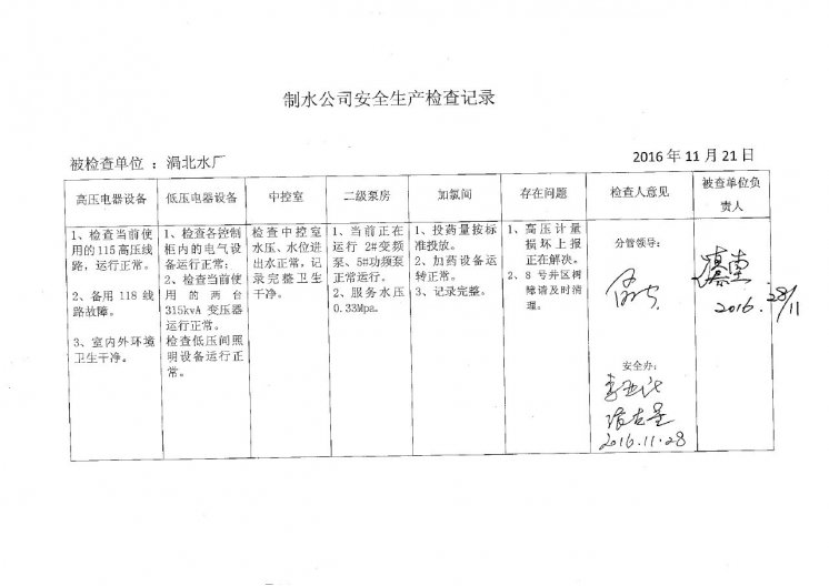 渦北水廠2016年11月安全生產(chǎn)檢查記錄