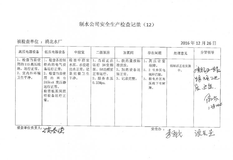 渦北水廠2016年12月安全生產(chǎn)檢查記錄