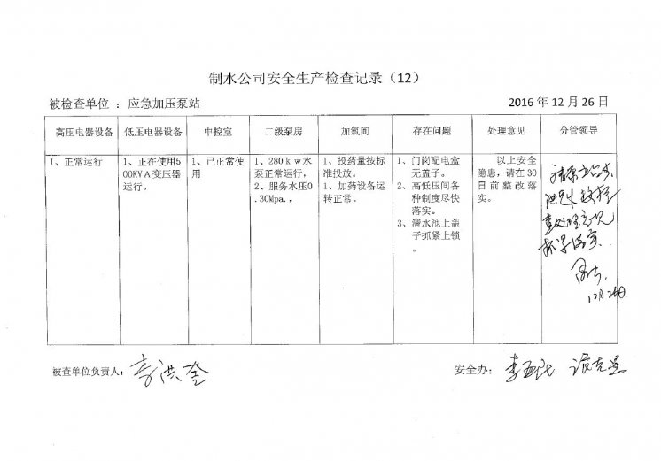 加壓泵站2016年12月安全生產(chǎn)檢查記錄