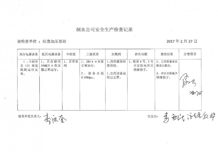應(yīng)急加壓泵站2017年2月安全生產(chǎn)檢查記錄
