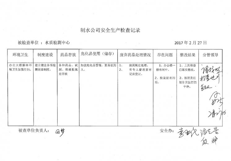 水質(zhì)檢測中心2017年2月安全生產(chǎn)檢查記錄
