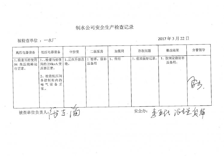 一水廠2017年3月安全生產(chǎn)檢查記錄