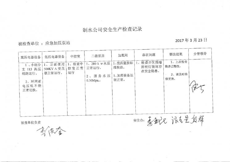 加壓泵站2017年3月安全生產(chǎn)檢查記錄