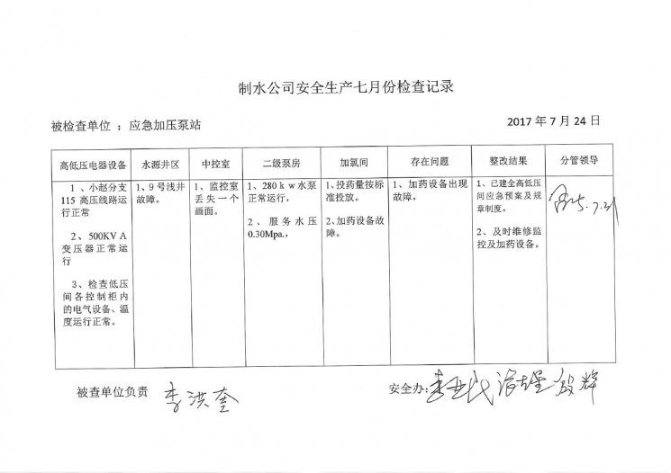 應(yīng)急加壓泵站2017年7月安全生產(chǎn)檢查記錄