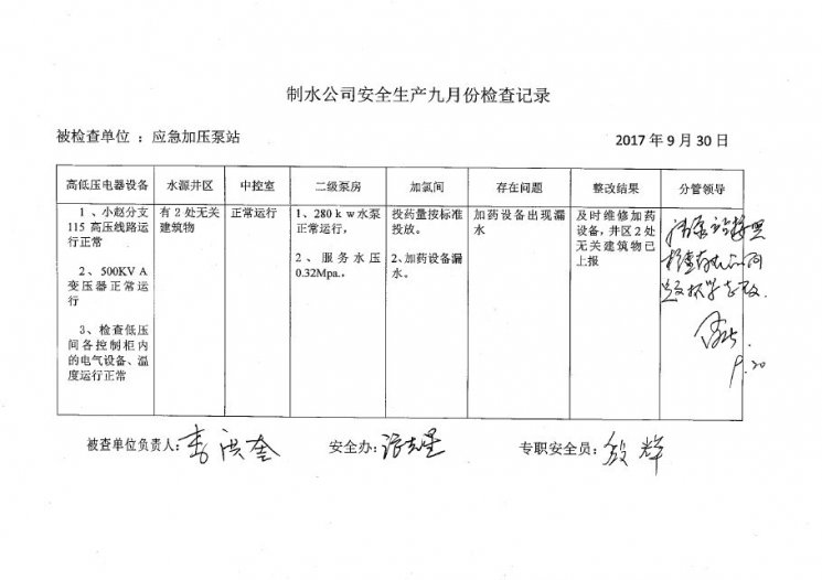 加壓泵站2017年9月安全生產(chǎn)檢查記錄