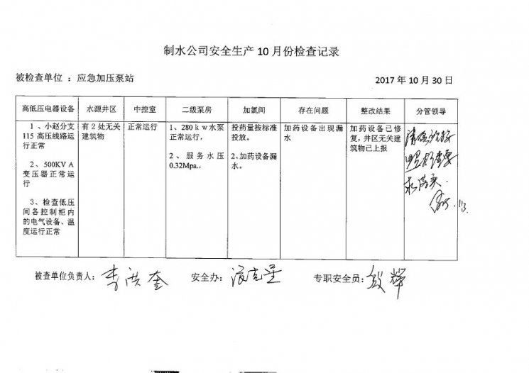 應(yīng)急加壓泵站2017年10月安全生產(chǎn)檢查記錄